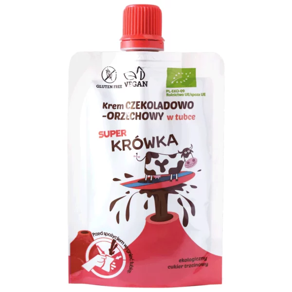 Pyszny wegański krem czekoladowo-orzechowy w formie wygodnej tubki, mieszczącej się w kieszeni, torebce, czy plecaku.