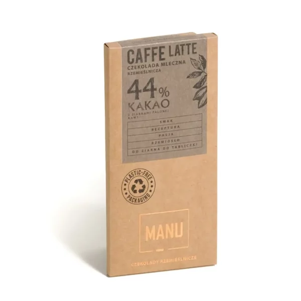 MANU – caffe latte – czekolada mleczna 44% kakao z ziarnami palonej kawy