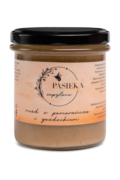 Kremowy miód wielokwiatowy z dodatkiem 3% liofilizowanej pomarańczy i odrobiną, czyli 0,5% zmielonych goździków.