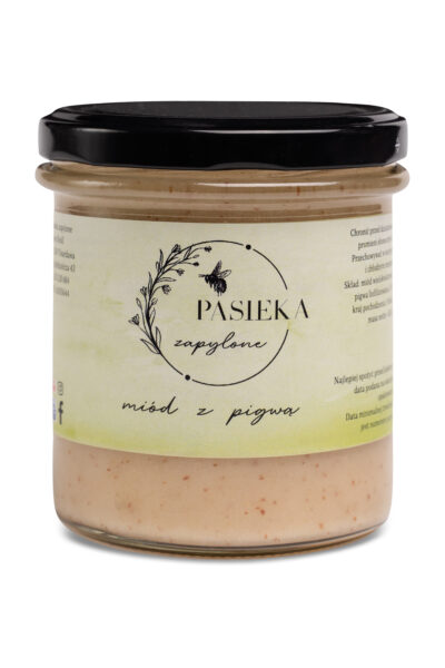 Kremowy miód z pigwą to połączenie miodu wielokwiatowego z naszej pasieki z 3% pigwy liofilizowanej.