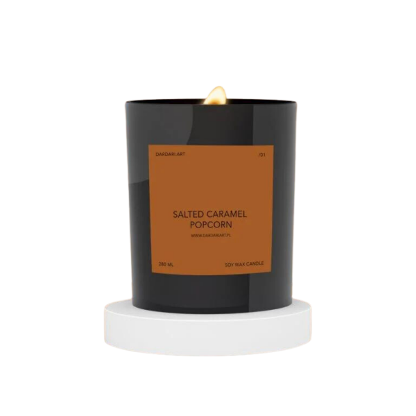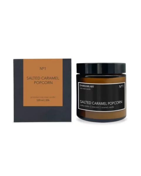 Świeca sojowa z drewnianym knotem o przyjemnym aromacie popcornu i słonego karmelu.