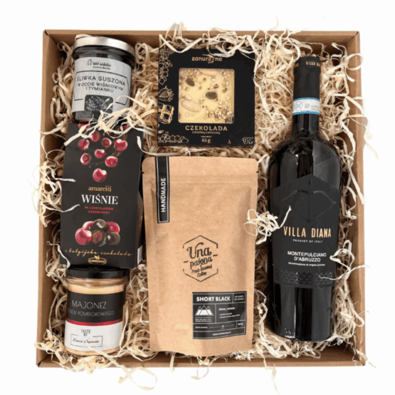 Bogata kompozycja produktów premium. Idealnie sprawdzi się jako zestaw prezentowy dla szefa, pracownika, klienta. W paczce możemy znaleźć wino białe lub czerwone, kawę manufakturową, praliny, śliwkę suszoną w occie, majonez z oleju pomidorowego.