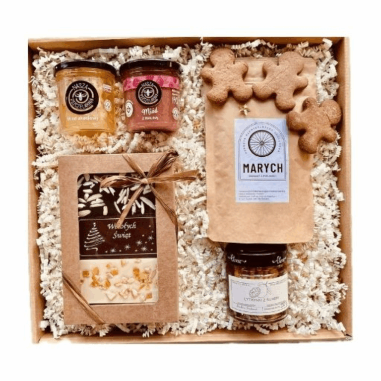 Zestaw w kraftowej kolorystyce na wybranym kolorze wiórków. Pudełko dowolne do wybrania. Do zestawu gratis kartka świąteczna.