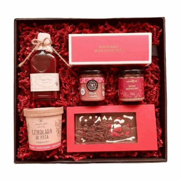Zestaw w czerwonej kolorystyce na wybranym kolorze wiórków. Pudełko dowolne do wybrania. Do zestawu gratis kartka świąteczna.