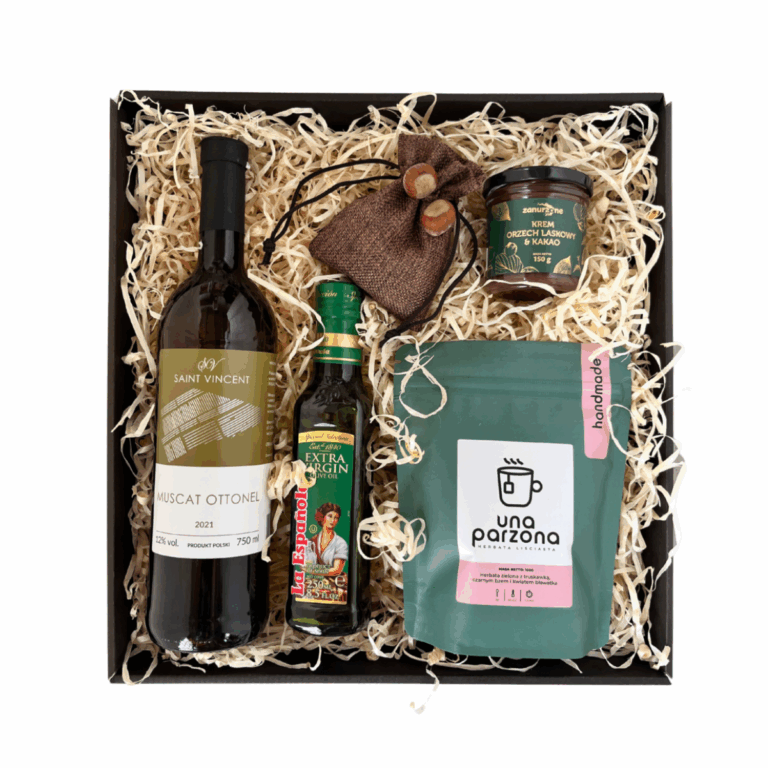 Taki zestaw upominkowy przypadnie do gustu każdemu. Wysokiej jakości białe wino, herbata, oliwa czy krem orzechowy to tylko niektóre produkty znajdujące się w tej bogatej paczce.