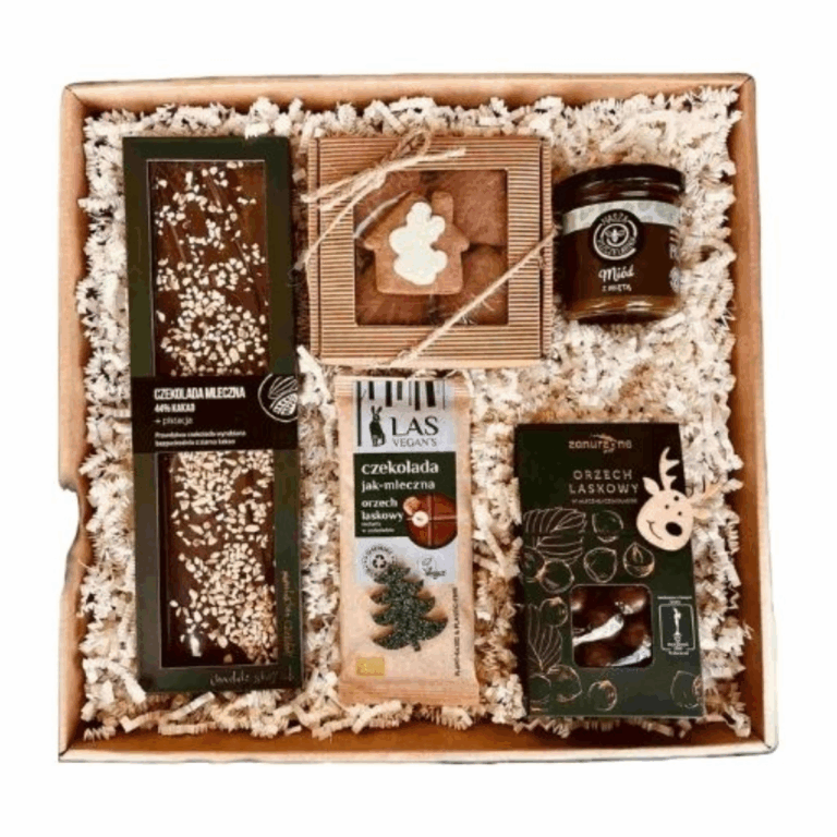 Zestaw w kraftowej i zielonej kolorystyce na wybranym kolorze wiórków. Pudełko dowolne do wybrania. Do zestawu gratis kartka świąteczna.