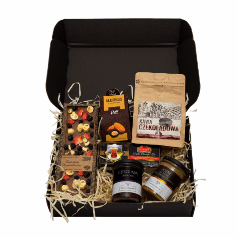 W skład zestawu wchodzą słodkie produkty i kawa aromatyzowana w smakach świątecznych. Znajdziesz w nim manufakturowe specjały.